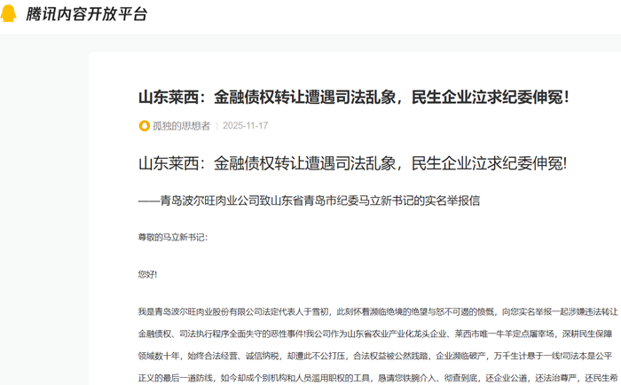 我是青岛波尔旺肉业股份有限公司法定代表人于雪初,此刻怀着濒临绝境的绝望与怒不可遏的愤慨,向您实名举报一起涉嫌违法转让金融债权、司法执行程序全面失守的恶性事件!我公司作为山东省农业产业化龙头企业、莱西市唯一牛羊定点屠宰场,深耕民生保障领域数十年,始终合法经营、诚信纳税,却遭此不公打压,合法权益被公然践踏,企业濒临破产,万千生计悬于一线!司法本是公平正义的最后一道防线,如今却成个别机构和人员滥用职权的工具,恳请您铁腕介入、彻查到底,还企业公道,还法治尊严,还民生希望!