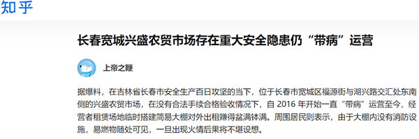据爆料,在吉林省长春市安全生产百日攻坚的当下,位于长春市宽城区福源街与湖兴路交汇处东南侧的兴盛农贸市场,在没有合法手续合格验收情况下,自 2016 年开始一直“带病”运营至今,经营者租赁场地临时搭建简易大棚对外出租赚得盆满钵满。周围居民则表示,由于大棚内没有消防设施,易燃物随处可见,一旦出现火情后果将不堪设想。