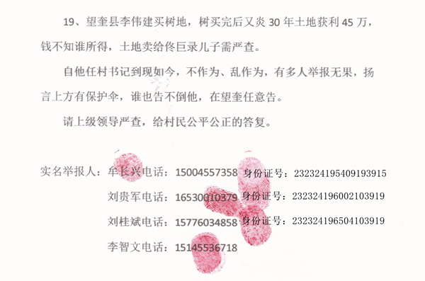 自他任村书记到现如今,不作为、乱作为,有多人举报无果,他还扬言上方有保护伞,谁也告不倒他,在望奎任意告。