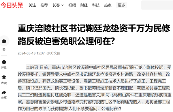 本站讯 日前,重庆市涪陵区珍溪镇中峰社区居民及原书记鞠廷龙向媒体投诉:受珍溪镇委托,镇领导要求中峰社区书记鞠廷龙垫资修建乡村道路,改变村容村貌,改善基础设施。鞠廷龙购买工程设备、雇请工程施工技术人员进行了施工。工程完工后,镇书记邱国光、镇长石以超、副书记蒋腾蛟却新官不理旧账,鞠廷龙讨要工程款民工工资时遭到拒付还被免职,还遭遇迫害关押!河北马树山案件在重庆涪陵珍溪镇重演。蓄意陷害垫资修建乡村道路改变村容村貌的社区书记鞠廷龙的人,则将全部工程作为自已的政绩而获得提拨!人们不禁要追问,公理何在?!