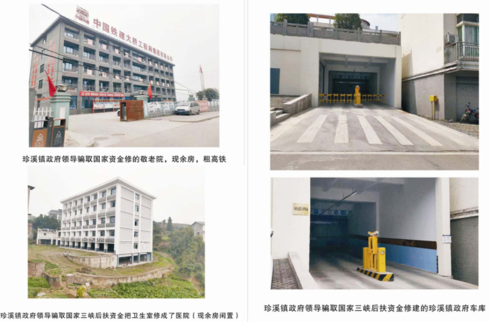 村民们还说:镇领导修建豪华政府办公楼和车库,修建闲置敬老院和卫生院,对抗上级组织检查,造假,将豪华办公楼和车库挂社区招牌对抗组织排査,巧立名目骗取国家项目资金。镇党委书记邱国光如此作风,竟然被提拔为涪陵区生态环境局局长,镇长石以超被提拔为镇党委书记。这些人形式主义、官僚主义、两面人,现任镇党委书记石以超擅自篡改信访材料、诉求,敷衍塞责。之前,珍溪镇政府就出具虚假文件,区政府发改委文件尚未下达,实施文件就提前签发,推诿卸责扯皮,债务让村委承担,严重违背党性原则。镇政府对鞠廷龙垫资修建民生工程建设款1000多万元拒绝支付, 并在鞠廷龙讨要时无任何理由直接罢免其中峰社区党支部书记,不听民意、独断专行,利用领导权力以权压法、逐利违法、随心所欲,报送黑材料使社区书记鞠廷龙被关押15天。目前,鞠廷龙已申请国家赔偿,公安机关已经纠错。现在,鞠廷龙要求聘请第三方机构评估其垫资建设道路等民生工程量,并支付他垫资的成本工程款。鞠廷龙已向中纪委、国家信访局、全国人大、全国政协等单位控告投诉,并已收到信访回执。