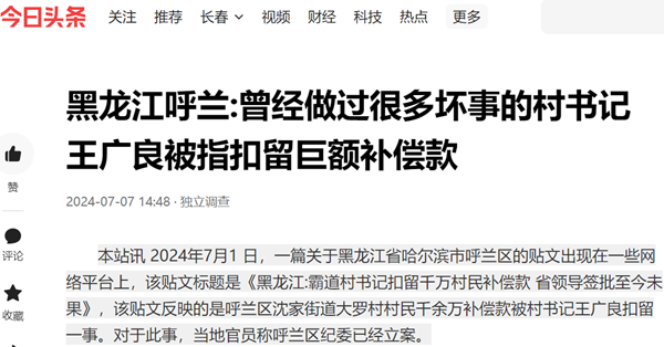 本站讯 2024年7月1 日,一篇关于黑龙江省哈尔滨市呼兰区的贴文出现在一些网络平台上,该贴文标题是《黑龙江:霸道村书记扣留千万村民补偿款 省领导签批至今未果》,该贴文反映的是呼兰区沈家街道大罗村村民千余万补偿款被村书记王广良扣留一事。对于此事,当地官员称呼兰区纪委已经立案。