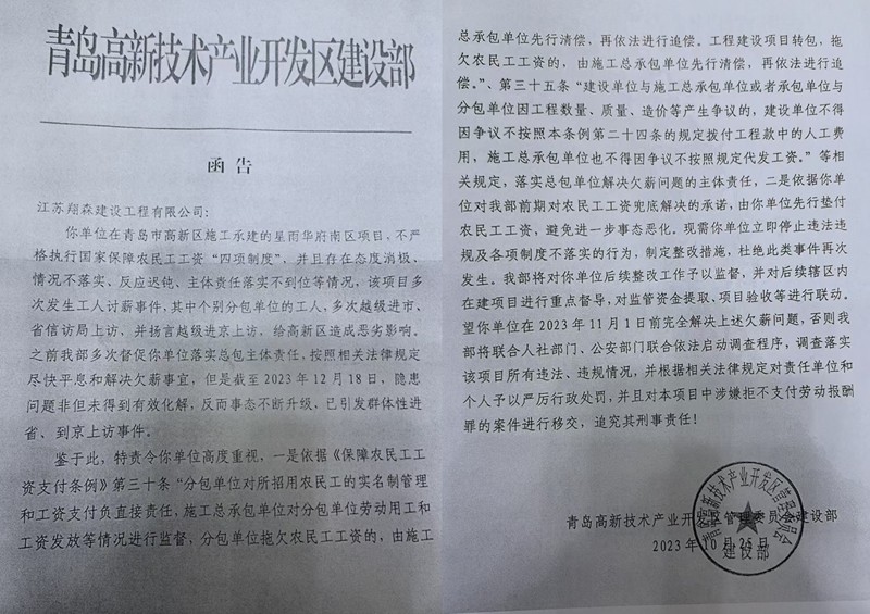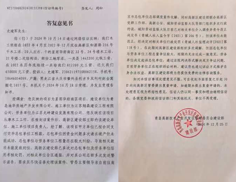 青岛高新技术产业开发区管理委员会建设部出具的答复意见书(信访件编号WT370000202410155398签发人:周松)证实了农民工们反映的问题。