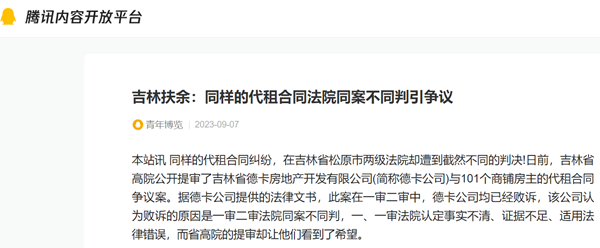 本站讯 同样的代租合同纠纷,在吉林省松原市两级法院却遭到截然不同的判决!日前,吉林省高院公开提审了吉林省德卡房地产开发有限公司(简称德卡公司)与101个商铺房主的代租合同争议案。据德卡公司提供的法律文书,此案在一审二审中,德卡公司均已经败诉,该公司认为败诉的原因是一审二审法院同案不同判,一、一审法院认定事实不清、证据不足、适用法律错误,而省高院的提审却让他们看到了希望。