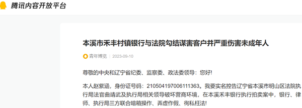 本人赵紫涵,身份证号码:210504197006111363。我要实名控告辽宁省本溪市明山区法院执行局法官曲靖武及执行局相关领导破坏营商环境,在本溪禾丰银行执行拍卖案中,银行、律师、执行局三方联合暗箱操作、弄虚作假、徇私枉法!
