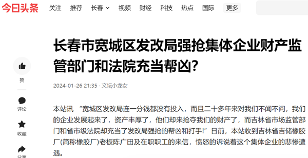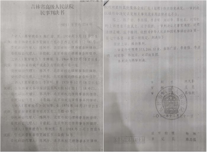 陈广田等向媒体提供证据并介绍说:长春市宽城区发改局联合省市场监管厅审批办,捏造证据制造虚假诉讼主体,罔顾历史滥用法律手段,凭借行政机关优势,协调省市两级法院,利用司法手段,巧取豪夺集体企业资产,好端端的一个企业硬是给搞死了。