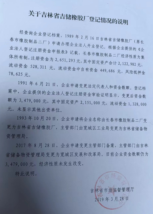 记者从橡胶厂职工们处看到一份吉林省市场监督管理厅于2019年3月28日出具的《关于吉林省吉储橡胶厂登记情况的说明》。该说明称:“经查询企业登记档案,1989年2月16日,吉林省吉储橡胶厂(原长春市橡胶制品二厂)申请办理企业法人开业登记。根据企业提供的《企业法人登记注册资金申报表》记载,长春市橡胶制品二厂经济性质为集体所有制,注册资金为2,651,293元,其中固定资产合计2,122,982元,流动资金528,311元。流动资金中自有资金449,686元,风险抵押金78,625元。1991年6月21日,企业申请变更法定代表人和资金数额。登记档案中,企业提供的企业法人登记注册资金审验证明显示,变更后资金数额为3,479,000元,其中固定资产2,151,000元,流动资金1,328,000元。未显示其他出资单位。1993年10月20日,企业申请将企业名称由长春市橡胶制品二厂变更为吉林省吉储橡胶厂,主管部门由宽城区工业局变更为吉林省储备物资管理局。2017年8月28日,企业申请变更主管部门备案,主管部门由吉林省储备物资管理局变更为宽城区发展和改革局。目前企业资金数额仍为3,479,000元,经济性质未发生改变。”