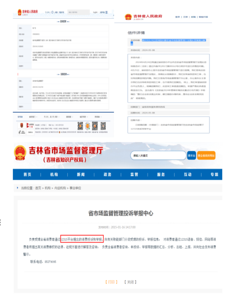 5月8日,他们再次给接诉即办平台去信,希望对4月25日的回复做出解释说明,究竟是哪个部门的答复。下午,接诉即办平台回复说是:办理部门是吉林省市场监督管理厅12315投诉举报平台。陈广田们再次分别向市场监督管理投诉举报中心和权益保护中心进行电话核实。投诉举报中心表示12315投诉举报中心和吉林省市场监督管理厅没有关系。权益保护处黄处长也表示,12315投诉举报中心属于吉林省政数局了。