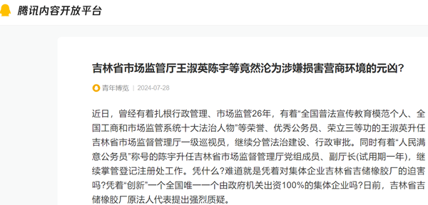 近日,曾经有着扎根行政管理、市场监管26年,有着“全国普法宣传教育模范个人、全国工商和市场监管系统十大法治人物”等荣誉、优秀公务员、荣立三等功的王淑英升任吉林省市场监督管理厅一级巡视员,继续分管法治建设、行政审批。同时有着“人民满意公务员”称号的陈宇升任吉林省市场监督管理厅党组成员、副厅长(试用期一年),继续掌管登记注册处工作。凭什么?难道就是凭着对集体企业吉林省吉储橡胶厂的迫害吗?凭着“创新”一个全国唯一一个由政府机关出资100%的集体企业吗?日前,吉林省吉储橡胶厂原法人代表提出强烈质疑。