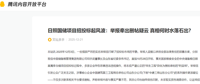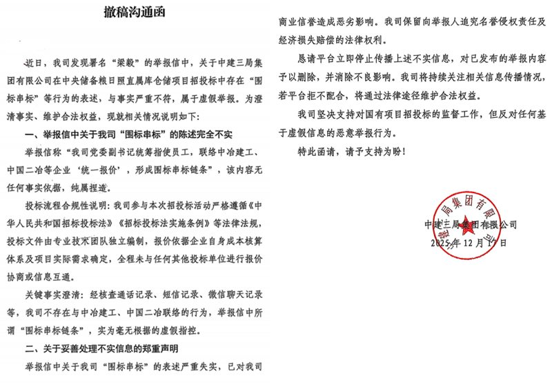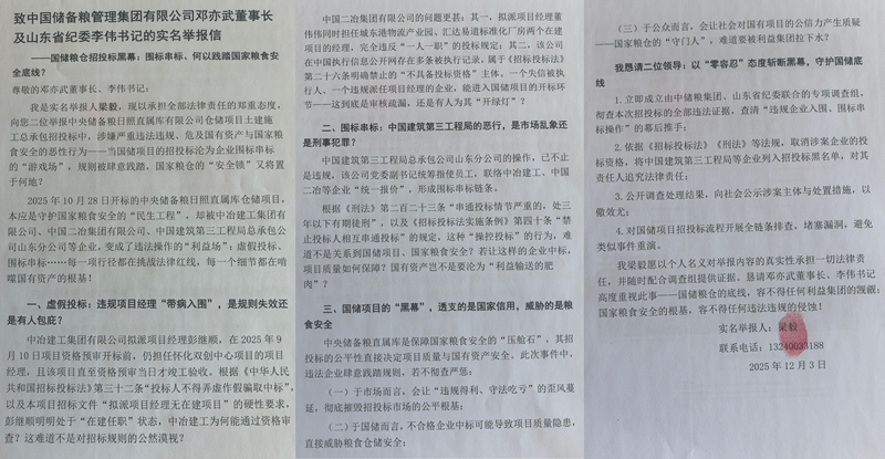 本站讯 2025年12月3日,一份措辞严厉的实名举报信打破了招投标市场的平静。举报人梁毅以承担全部法律责任的郑重态度,分别致信中国储备粮管理集团有限公司邓亦武董事长及山东省纪委李伟书记,直指10月28日开标、事关国家粮食安全的中央储备粮日照直属库仓储项目招投标过程中,多家企业存在恶意违法违规操作,将本应严谨公正的"民生工程"异化为围标串标的"利益场"。举报信引发公众广泛关注之际,涉事核心企业中国建筑第三工程局总承包公司山东分公司(下称"中建三局山东分公司")的系列操作更添疑云——不仅多次联系相关平台要求删帖,声称举报内容与事实严重不符,其总公司也始终保持沉默,未采取实质性调查动作,让这场招投标风波的真相愈发扑朔迷离。