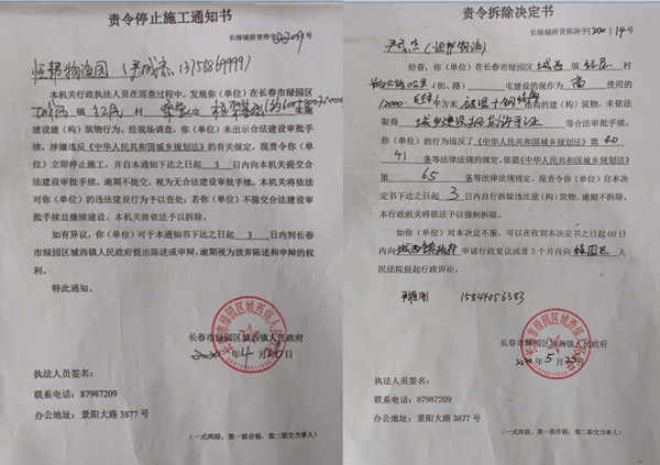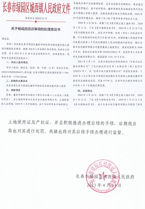 2023年4月17日下午,杨成昌收到绿园区城西镇政府《关于杨成昌信访事项的处理意见书》(绿城府发[2023]12号)。该意见书称:“经查:鑫恒邦酒店用品城位于原长白公路4.5公里处(现零公里处),该土地使用者为长春市成杰建材有限公司,土地性质是工业用地。2020年4月开始建设,由于当时四季青市场的拆迁,导致很多商户无法继续经营、且多次到省市区群体访,要求就近安排经营地点。由于时间紧迫,鑫恒邦酒店用品城项目须尽快完成工程施工并投入使用,未能及时进行相关手续的办理。2020年10月该项目建成后,接收了近100户原四季青市场业主入驻。2020年4月26日,我镇下达《责令停止施工通知书》。2020年5月11日,下达《责令拆除告知书》,2020年5月25日下达《责令拆除决定书》,决定书中明确:如您(单位)对本决定不服,可以在收到本决定书之日起60日内,向城西镇人民政府申请行政复议或者3个月内向绿园区人民法院提起行政诉讼。随后长春市成杰建材有限公司提供集体土地使用证,使用权面积为5000平方米;房权证长房权字第201601220612号,房屋所有人为长春市成杰建材有限公司,建筑面积1145.19平方米。”