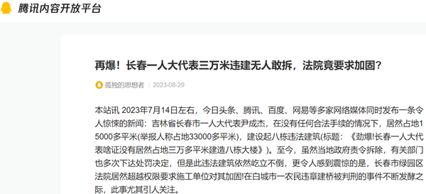 本站讯 2023年7月14日左右,今日头条、腾讯、百度、网易等多家网络媒体同时发布一条令人惊悚的新闻:吉林省长春市一人大代表尹成杰,在没有任何合法手续的情况下,居然占地15000多平米(举报人称占地33000多平米),建设起八栋违法建筑(标题:《劲爆!长春一人大代表啥证没有居然占地三万多平米建造八栋大楼》)。至今,虽然当地政府责令拆除,有关部门也多次下达处罚决定,但是此违法建筑依然屹立不倒,更令人感到震惊的是,长春市绿园区法院居然超越权限要求施工单位对其加固!在白城市一农民违章建桥被判刑的事件不断发酵之际,此事尤其引人关注。