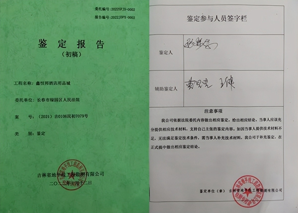 杨成昌与鑫恒邦签订承包合同的公司是吉林省天枫劳务有限公司(简称天枫公司)。2023年3月11日,天枫公司收到吉林省地平线工程勘测有限公司(以下简称“鉴定机构”)受法院委托出具的《鑫恒帮酒店用品城的质量鉴定报告(正式稿)》(以下简称“鉴定报告”)。杨成昌介绍:经现场实测,并结合相关资料比对,我方发现鉴定报告正式稿存在数据不真实,界线认定错误等情况,我公司不认可也不接受该鉴定报告。