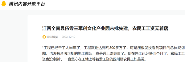 日前,贵州中亚建设有限公司云南第五分公司(下称:贵州中亚公司)员工向媒体投诉反映称:我公司于2023年4月25日和伍零三(全南)实业有限公司(下称伍零三公司)签订了军创文化产业园项目建设总承包合同。合同编号为:伍零三全南(2023)第0425号,工程名称为:伍零三(全南)军创文化产业园项目建设,工程地点:江西省全南县南迳镇,发包人:伍零三(全南)实业有限公司(甲方),承包人:贵州中亚建设有限公司云南第五分公司(乙方)。合同条款显示:建安投资约20亿元人民币,其中第一期约1亿元人民币,建设周期为36个月,自2023年4月25日至2026年4月24日,为期1080天。合同签订完毕后,伍零三公司同时开具项目进场通知书,通知4月26日进场并组织施工,工程款支付方式为第一次支付节点2023年8月31日,之后按月进度支付工程款。