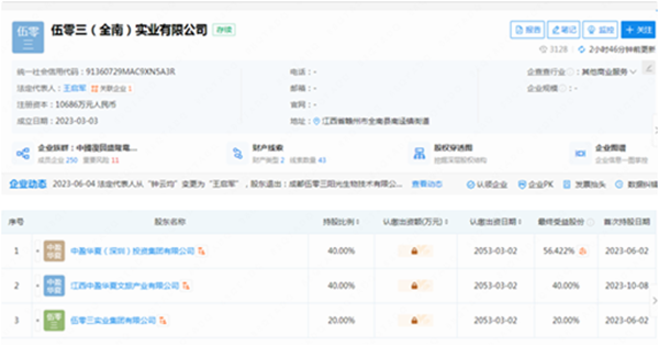 企查查显示:伍零三(全南)实业有限公司法人代表是王启军,注册资本10686万元人民币,股东有中盈华夏(深圳)投资集团有限公司(持股比例40%)、江西中盈华夏文旅产业有限公司(持股比例40%)、伍零三实业有限公司(持股比例20%)。