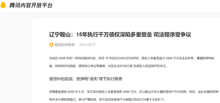 本站讯 2008 年的一场民间借贷纠纷,历经 15 年诉讼与执行仍未终结。债权人李春普追讨 2590 万元本金及利息,遭遇抵押物转移、担保物评估瑕疵、债权转让争议等障碍,引发社会对“执行难”及债权人权益保护的关注。