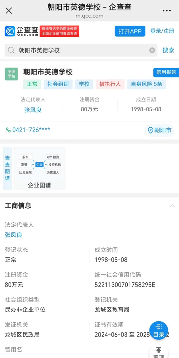 通过企查查查询得知,到截止到8月下旬,朝阳市英德学校法人依然是张凤良,没有变更。(冯娇)