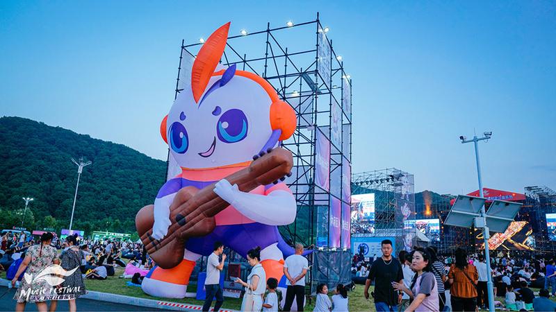 奔赴而来的乐迷们齐聚映山红广场,现场的精彩设置也为观众提供了观演之外的更多体验。有人漫步江畔山野间,眺望远处群山,在天幕下短暂休憩;有人游走在美食街区、文创市集,收获特色美食和多元文化带来的惊喜体验。而现场,以“宇欢欢”形象设计的艺术装置更是成为了观众间的热门打卡点。
