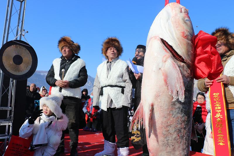 中国·松花江旅游季暨第二届松花江冬捕文化节系列活动中打捞出来的头鱼41斤,拍卖58888元