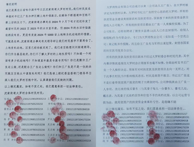 8月初,大罗村村民们再次向媒体反映:在媒体不断报道、百姓不断上访和上级纪检机关的压力下,沈家街道办事处终于补发了截留大罗村村民的2022和2023年的粮补款,但是2024年的依然没有发,更没有发放2024年的4700万占地补偿款。即使是这样,沈家街道办事处个别领导却让村民签息访协议不要在告了,并称土地变成机动地区里已经拍板定死了。然而,大罗村村民们想问问街道办领导,你们作为基层政府,不了解大罗村的土地性质吗?不知道一个村该有多少机动地吗?不知道直补款是专款专用吗?你们是默许王广良这么做还是配合王广良这么做?你们与王广良是不是一伙的共同欺骗老百姓并从老百姓身上非法谋取私利?我们恳请上级纪检、监察机构严查,给老百姓一个明确的交代!