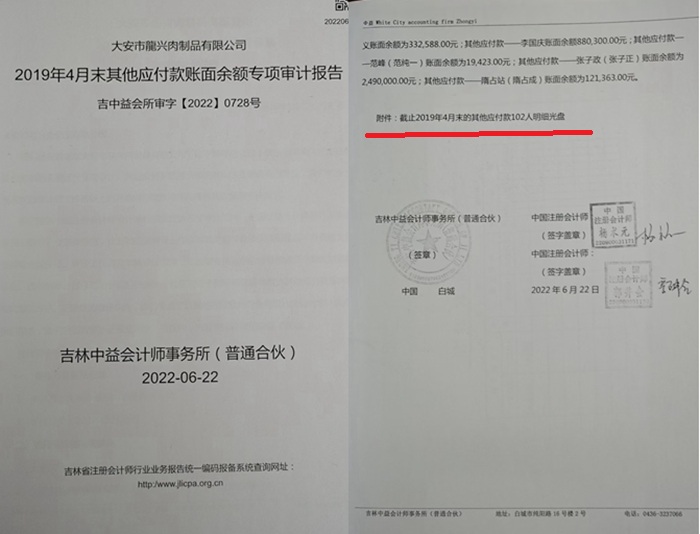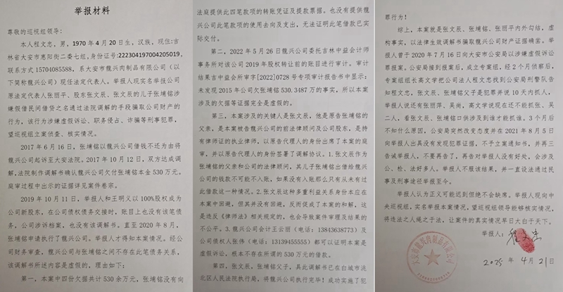 根据举报人提供的调解书显示,2017年6月,张埔铭(张文辰之子)以龙兴公司拖欠借款为由起诉,同年10月双方达成调解,法院确认龙兴公司欠付张埔铭本金530余万元及相应利息。“最奇怪的是,这笔所谓的‘借款’在公司财务账目中完全没有痕迹。”程文忠指出,他委托吉林中益会计师事务所对2019年股权转让前的账目进行审计,吉中益会所审字[2022]0728号报告明确记载:“未发现2015年公司欠张埔铭530.3487万元的事实。”