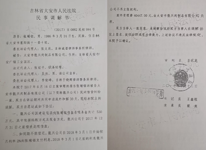 “我2019年接手公司时,工商档案和财务账目清晰,没有任何关于530余万元债务的记录。”程文忠回忆道:当年10月,他与合伙人王明义以股权转让方式获得龙兴公司100%股权,原法定代表人张丽平、股东张文辰等人退出。“交接时,原股东明确表示公司所有账目清晰,我们才放心完成交易。”然而,平静仅维持了不到一年。2020年8月,大安市法院突然送达执行通知书,要求龙兴公司履行(2017)吉0882民初984号民事调解书确定的义务,程文忠这才得知公司已因此笔债务被强制执行。