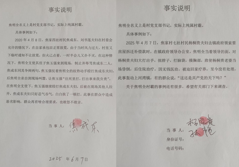 类似的暴力事件并非个例。2020年4月,四社村民焦成东夫妇在自家承包田正常放荒时,因风力过大引发意外,焦明全指使侄子焦玉强到场辱骂殴打,甚至叫嚣"往死里打,打出事来我负责",导致焦成东夫妇受伤却敢怒不敢言。村民无奈的表示:"他在村里就是土皇帝,谁不听话就打压谁,我们连正常维权都怕遭到报复。"