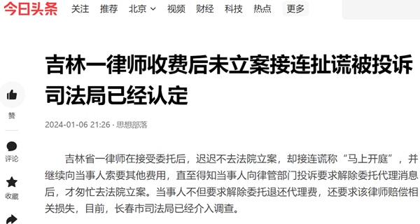 吉林省一律师在接受委托后,迟迟不去法院立案,却接连谎称“马上开庭”,并继续向当事人索要其他费用,直至得知当事人向律管部门投诉要求解除委托代理消息后,才匆忙去法院立案。当事人不但要求解除委托退还代理费,还要求该律师赔偿相关损失,目前,长春市司法局已经介入调查。