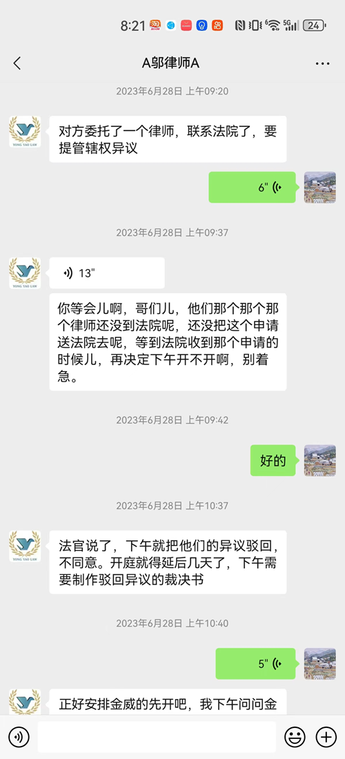 6月28日上午9点37分,就在孙荣增整装待发的时候,邬律师微信通知孙荣增先别去经开区法院,称对方律师已向法院提出管辖权异议,异议申请书送到法院之后才能决定下午能否开庭。