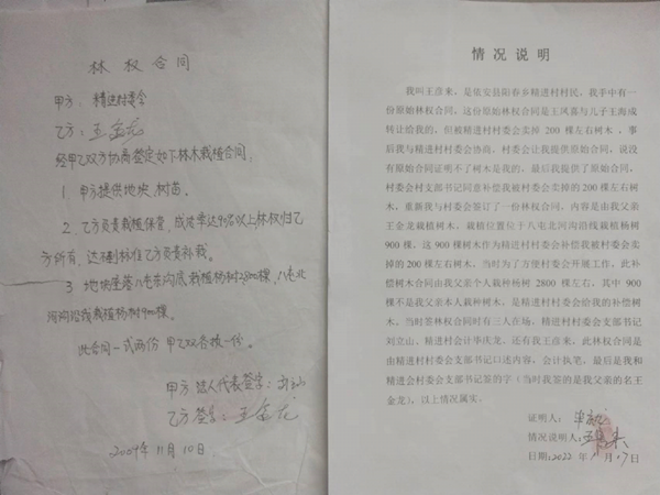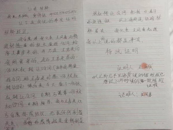 在林权证具体申办环节是,投诉人王彦来于2015年8月为案涉林权办理了林权证,此前王彦来是在2008年与王凤喜、王海成口头约定:王凤喜将林权转给投诉人。投诉人王彦来办下来林权证后,将树卖了再付钱给王凤喜。当时确实没有达成书面合同,之后,投诉人为了办理林权证,遂找到王凤喜、王海成将2008年的口头协议落实为书面合同,其合同内容与2008年双方达成的口头协议一致,所以落款日期仍为2008 年4月1日。这就是实际情况。补办时间虽然是跨越有点长,人们都是知道,在政府行政部门办手续,特别是老百姓个人的手续,并不是那么容易的。别说是个人了,就是政府招商引资的重大项目,在全国各地,为了留下投资人的加入,都是千方百计在政策上,手续办理中开放绿灯,比如土地流转和环评手续,甚至开工报告在农民工劳动保证金没有提前预交的情况下,政府部门为了促成项目开发,有时候都是默许他们开发商先投入实际开工建设之后,再补办法律所规定的手续。这样的事是比较普遍的,只要是后期补办下来的手续,证件真实合法就没有错误,更不是违法行为。投诉人王彦来并没有伪造村民代表签字,林权转让表决书上,投诉人是代村民代表在林权转让表决书上签字,事后取得许焕玉、石殿付、王义军、于宝林、张庆和、陈万军、陈平、杨振、杜启亮的代为签名授权。村民代表在证人证言中,表述没有在村民表决书上签字按手印,而这不代表村民代表,没有授权投诉人王彦来,在林权转让表决书上代为签名。这只能说明投诉人王彦来在办理此手续存在程序性瑕疵,但林权转让表决书仍具有法律效力,况且该林权证有精进村委会的授权,还有法人及村书记亲笔签字、村委会所盖公章、乡政府领导批示及乡林业站领导的签字盖章。特别是林业站负责人的签字,他是代表国家行政主管单位的认证性质,说明林权证的更加真实合法有效。