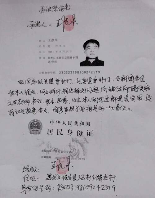 投诉人:王彦来,男,汉族,原中共党员,退伍军人,依安县精进村民兵连长后任村支部书记,1981 年9月24日出生,身份证号码:230223198109242519。