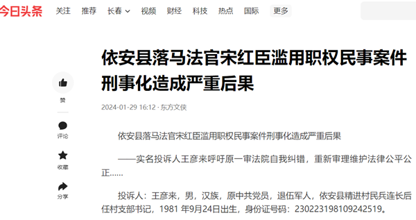 投诉事实:投诉人王彦来,在一起民事合同林权转让过程中,被他人诬告说是合同诈骗,因为主审法官宋红臣(现已经被双开并且判刑)在开庭审理案件时,不依据事实,不尊重法律,导致民事案件刑事化,法官本该可以退卷给公诉机关,他却利用职权,庭审现场不让受害人王彦来的多名证人在庭上说话,也不质证,主观刻意片面采信对投诉人完全不利的证据,对受害人王彦来做出犯诈骗罪三年六个月的刑事判决。最令人惊叹的是,法官认定是刑事责任,事实上却一个受害人都没有。判决书判决的是合同诈骗,但是因为受害人王彦来没有诈骗,所以不论在林权合同转让之前,还是转让以后,直到法院发布判决,国家没有任何经济损失,村委会没有任何损失,集体经济村民小组没有任何损失,参与合同转让的人也没有任何损失,受害人王彦来也没有得到一分钱,没有卖过一棵树,没有得到其它任何补偿。本来的民事合同流转问题,依据国家法律和相关司法解释不能定性为刑事案件,但主审法官宋红臣不做退卷处理,断然判处受害人王彦来刑事责任,致使王彦来丢失了政治生命,让光荣的退伍军人荣誉蒙羞。另外,在2023年12.月15日,依安县阳春乡精进村村民韩永付、韩文财兄弟二人,也是拿着原有的林权合同,也是同一个性质的承包形式,也是在同一个村委会,同一个林业行政部门核发的林权手续。因为村里建猪舍时,放了他们家合同范围内的杨树,韩文财兄弟俩就找精进村村民委员会要求赔偿解决,结果人家不但没有触犯任何法律,还拿到了林木补偿款。而投诉人王彦来手里有证据,包括当时的会议协商记录等。这是法律在与原则开了善意的玩笑,还是当地政府部门与政策法规开了善意的玩笑?!在法律面前对投诉人王彦来而言不公平,不公正,又将带给人们怎样的沉重思考?所以,王彦来为了洗刷自己的冤情,维护法律公平公正,坚决呼吁维权……