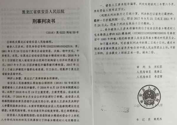 事件回放:在上世纪八十年代,依安县阳春乡精进村村委会,和本村村民王凤喜签订了一份关于阳春乡八屯东路西主带1956棵的杨树管护合同,这个合同中的杨树分为两部分,第一就是原有树带,这部分树带丢失一颗应从分成部分扣回二棵,另外一部分就是八三年,八四年,八五年的新造林,这部分的树木,不成活或者丢失一颗,前两年罚款两角钱,并且及时补活,不补栽,或者不成活,那么就罚款五元钱,成材后丢失一颗按照乡政府管理规定罚款。这是合法有效的真实合同。在这个合同中,有规定约定条款,就是说承包人在管理过程中,出现问题必须及时补救并按照合同规定接受罚款,承包人王凤喜依旧可以合理取得分成,所剩林木并不是完全归村集体所有,这是最关键的问题,因为这是受害人王彦来为何不能被定性为诈骗罪责的关键所在。
