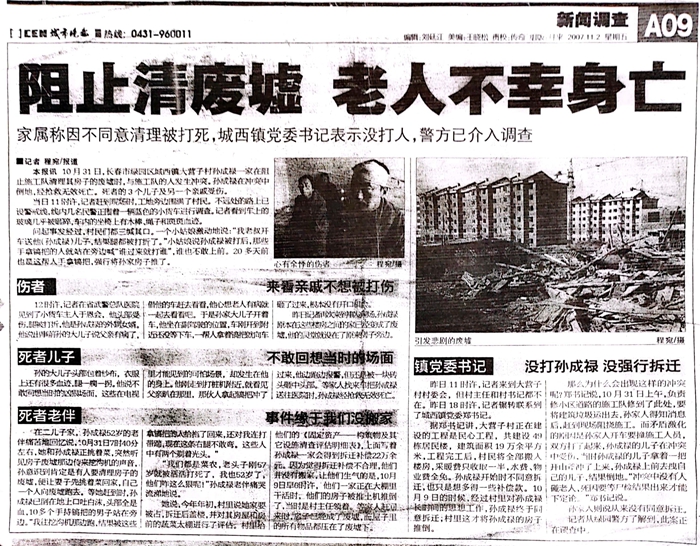 本站讯 17年前的2007年10月31日,吉林省长春市绿园区城西镇大营子村发生一起因强拆造成的死亡事件。事发后,几名直接参与打人的凶手已经被追究刑事责任,但是被害人家人们认为的“幕后主使”至今仍未被追究刑事责任。2024年2月2日,最高人民检察院作出《刑事申诉结果通知书》(高检刑申通【2024】211号)后,被害人孙成录的二儿子孙继宝找到媒体称:由于层层保护,此案的“幕后主使”董江、郭树和至今仍未被追究刑事责任,我们强烈要求追究董江、郭树和的刑事责任。