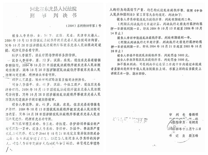 据判决书记载:对于东光县法院的指控,几名被告人均不认罪。被告人李秀珍辩称:我认为我没有冲击法庭,也没有骂任何人。我的行为不构成扰乱法庭秩序罪。其辩护人提交的辩护意见是: