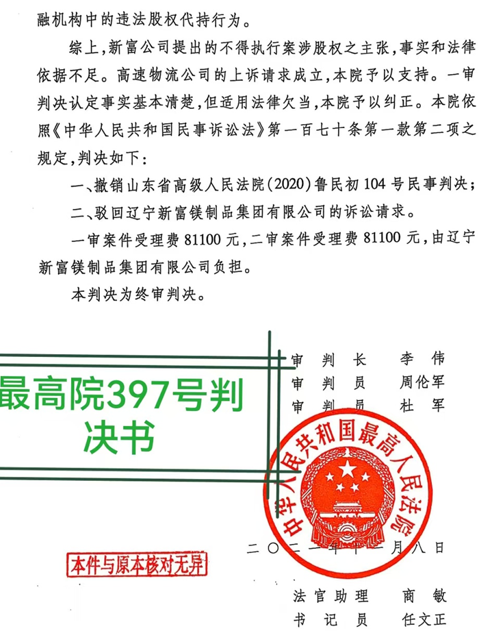 值得注意的是,这份397号判决从开庭到下达判决,最高院竟耗时近一年之久,而申请再审,则用近三年时间才被驳回,期间为何能拖这么久?究竟在等待什么?到最高院手里的案子全这么判吗?有内部人士向记者透露,山东高速物流号称山东第一国企,山东高院都判定其为非善意第三人,而最高院却作出了这样的判决,这背后究竟是怎样的情况?记者只好持续关注着。(沈记)
