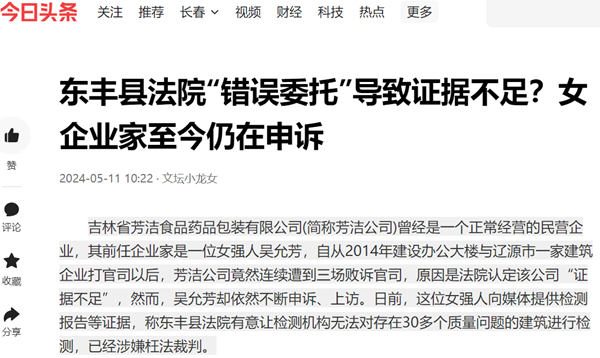 吉林省芳洁食品药品包装有限公司(简称芳洁公司)曾经是一个正常经营的民营企业,其前任企业家是一位女强人吴允芳,自从2014年建设办公大楼与辽源市一家建筑企业打官司以后,芳洁公司竟然连续遭到三场败诉官司,原因是法院认定该公司“证据不足”,然而,吴允芳却依然不断申诉、上访。日前,这位女强人向媒体提供检测报告等证据,称东丰县法院有意让检测机构无法对存在30多个质量问题的建筑进行检测,已经涉嫌枉法裁判。