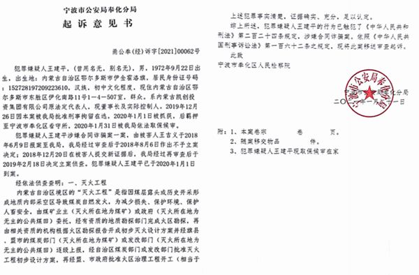 据王吉义介绍,案发后,他们曾经到鄂尔多斯本地报案,但由于当地某些官员的保护,鄂尔多斯警方未予立案侦查,无奈,他们只好回到浙江省宁波市奉化区报案。宁波市公安局奉化分局接到报案后,经过缜密的侦查,认定王建平诈骗事实清楚,构成合同诈骗犯罪,其做出的起诉意见书(甬公奉[经]诉字[2021]00062号)称: