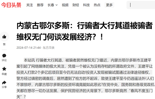 本站讯 行骗者大行其道,被骗者居然维权无门!最近,内蒙古鄂尔多斯市王建平案引起了网络媒体的极大关注,凭借一个被认为没有存档的所谓政府文件,王建平让投资人打款2个多亿后项目至今仍无法启动!投资人发现被骗试图通过法律途径维权,警方经过缜密的调查后,居然遭到了检方的不起诉,致使王建平至今仍逍遥法外!人们不禁惊呼,内蒙古鄂尔多斯的投资环境竟能如此恶劣?在党中央、国务院和各级党政机关都在想尽一切办法发展、保护民营经济的大背景下,鄂尔多斯竟然“春风不度玉门关”?