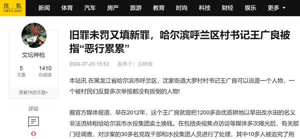 据官方媒体报道,早在2012年,这个王广良就曾把1200多亩优质耕地以旱田改水田的名义非法流转租给哈尔滨市水投集团卖土换钱。在包括央视焦点访谈等媒体多次曝光后,有关部门经调查,对涉案的30多名党政干部和水投集团人员进行了处理,其中10多人被追究了刑事责任,而王广良只是受到党内警告处分,之后又东山再起重新担任村书记。2024年7月1日以后,大罗村村民们再次举报其将5000亩承包地私自改成村集体机动地,将4700多万元补偿款长期扣押。对此,官方回应称,呼兰区纪委已经立案,可是半个月过去了,王广良依然嚣张跋扈如故!人们不禁惊呼,这个村书记到底有什么强大的靠山?难道他不断作恶,就没有人来管了不成?