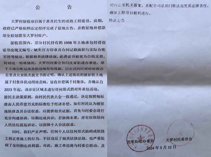 据村民们介绍,大罗村村民手中的水田至今已耕种了几十年,期间交过政府公粮、农业税、提留统筹等,村民手中还有国家发放的纳税通知书。在98年国家第二轮土地确权时,村民的水田被确权,并取得了《土地经营权证书》,村民还享受国家惠农补贴、粮补、植补等。但这一切却被一条道路打破了——2022年,哈尔滨开始修建都市圈环线五环路项目工程,村书记王广良在村民们不知情的情况下,带领环线北环永源至双井段工程项目部施工人员进入村民耕种的承包地里施工,村民这才发现自己的土地被政府征收了。村民们了解后才得知,在2023年11月10日,村书记王广良曾经以开村民代表大会的名义会同沈家街道发出联合公告,把村民的5000多亩水田承包地变成了村集体的机动地。但让村民们质疑的是,这些村民代表都是王广良指认的亲朋好友,并不是由全体村民选举产生的,不能代表村民的集体利益。更让村民们不解的是,大罗村水田和旱田总共才9000亩,《土地法》第六十三条明确规定村集体机动地不能超过村集体总面积的5%,超过5%不得再增加机动地。大罗村的5000多亩村民承包地怎么就突然变成了机动地?而且在村民不知情的情况下竟然被政府征收的?村民们十分不解。
