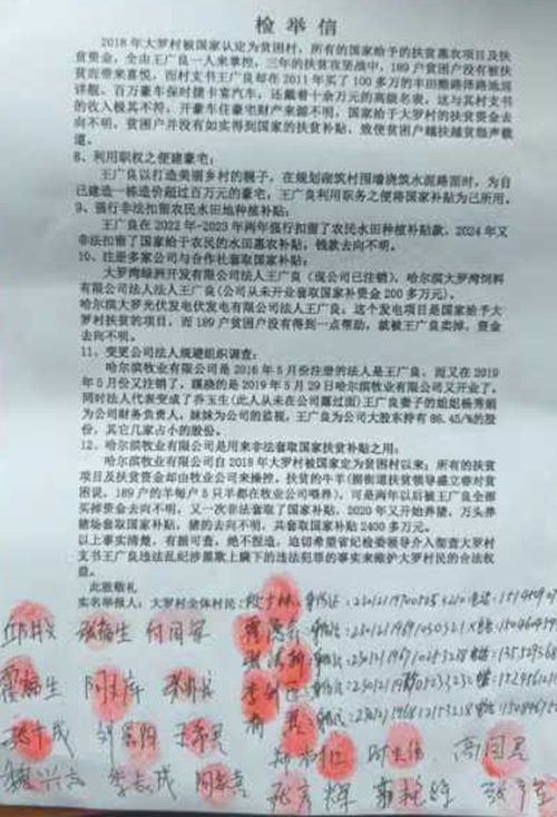村民们发现自己的承包地被强行征用后,就通过网上实名举报和信访等手段开始维权,同时还举报王广良截留大罗村2022、2023两年的粮食补贴款和2024年种植补贴款共500多万元未给村民发放等违法犯罪事实。